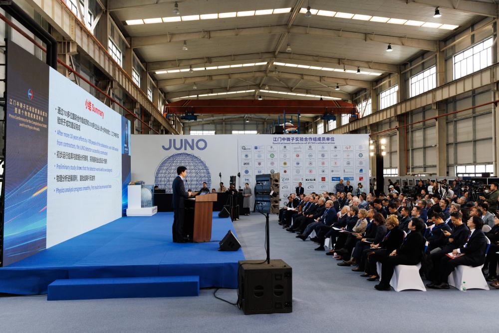 11月19日2025年,举办的揭晓会上正在广东省江门市,国际互帮组物理说明刻意人温良剑正在告诉首个物理劳绩中国科学院高能物理筹议所副所长、江门中微子实行。 金立旺 新华社记者摄
