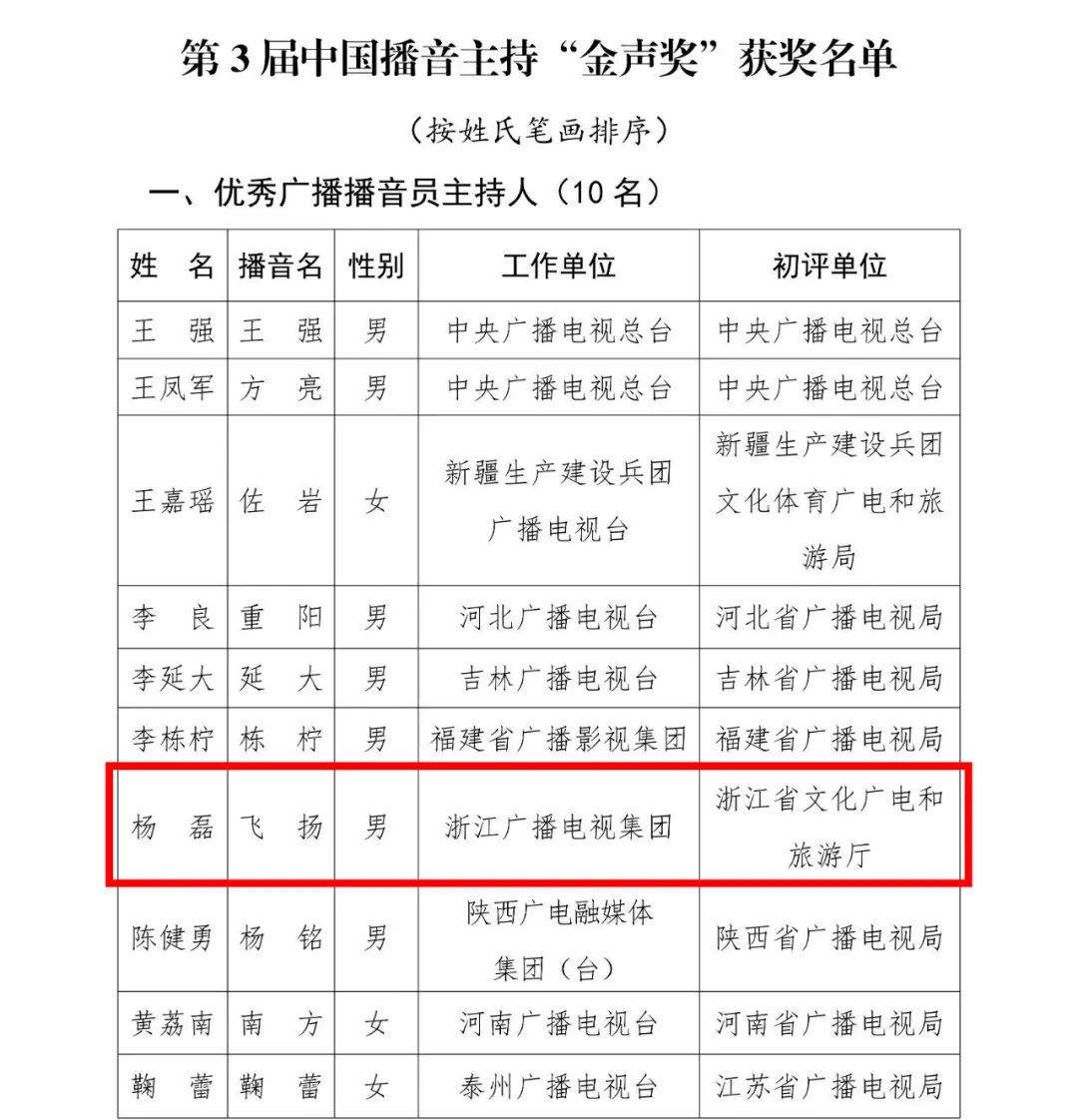 方才,声奖”获奖名单正式揭橥第3届中国播音主理“金,声的飞扬(杨磊)正在列浙江广电集团浙江之,音主理规模的最高奖得回了这一我国播。